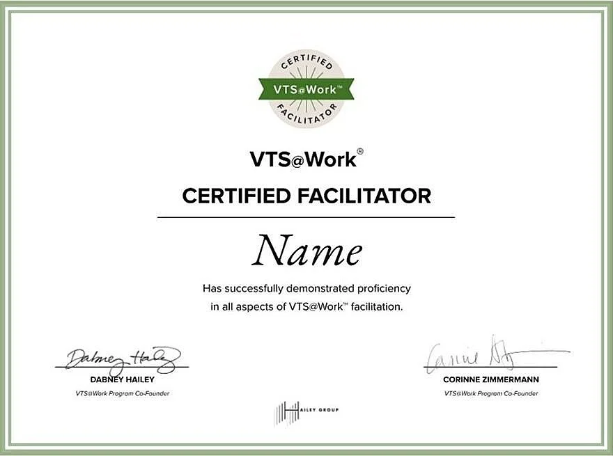 This program is designed to help you reach certification as a VTS@Work® Facilitator. The journey can continue with on a custom basis with VTS@Work® Coach training and VTS@Work® Trainer Training. Reach out for more information.